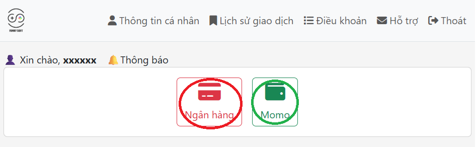 Sau khi đăng nhập vào trang trung tâm, các bạn có thể chọn nạp qua Ngân hàng (khoanh đỏ) hoặc Momo (khoanh xanh)