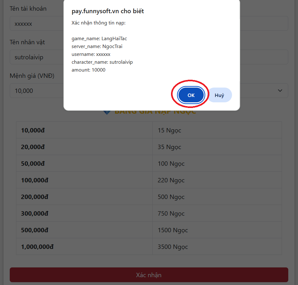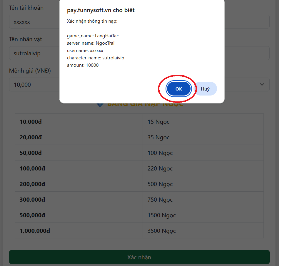 Hệ thống sẽ hiện 1 thông báo popup xác nhận thông tin muốn nạp. Các bạn sẽ kiểm tra nếu đúng hết thì bám OK