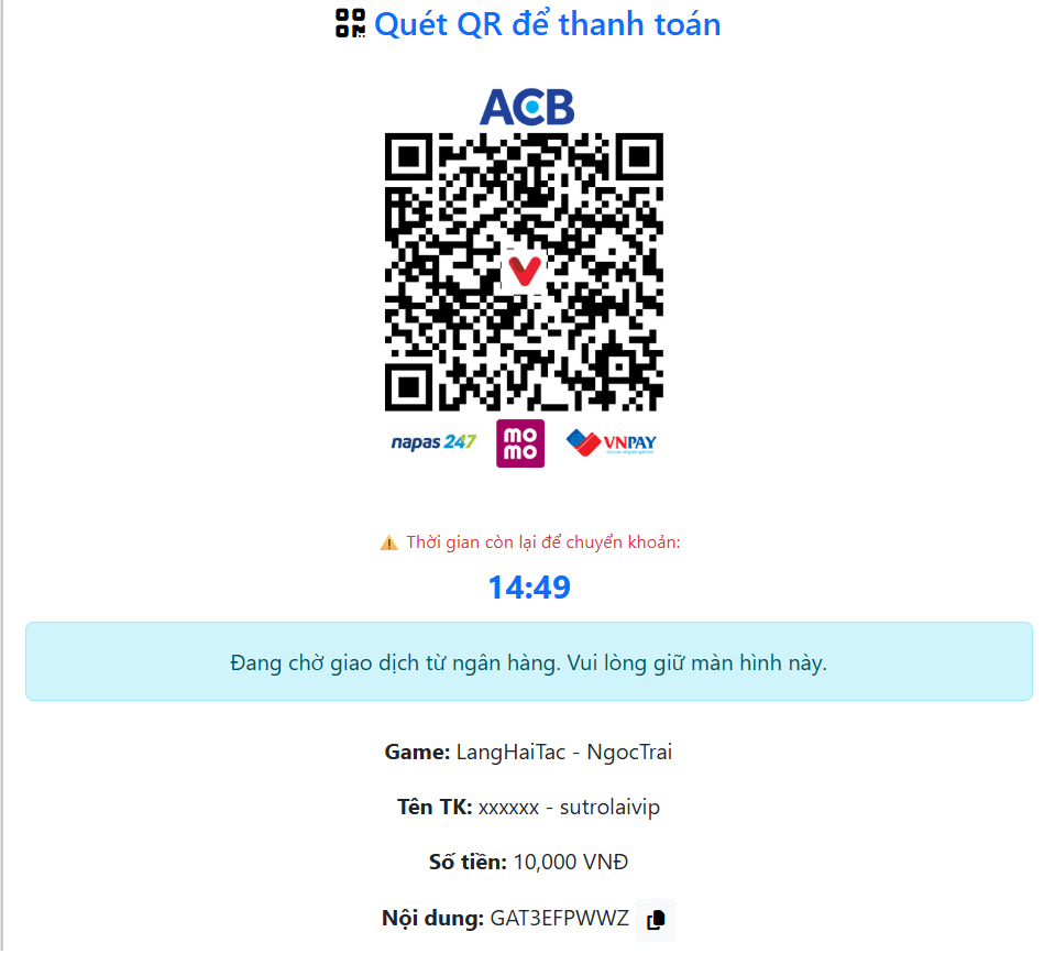 Sau khi bấm OK sẽ hiển thị trang quét mã QR nạp, mọi người vào app ngân hàng quét mã QR để hoàn tất. Sau khi nạp xong website sẽ trả về thông báo nạp thành công.