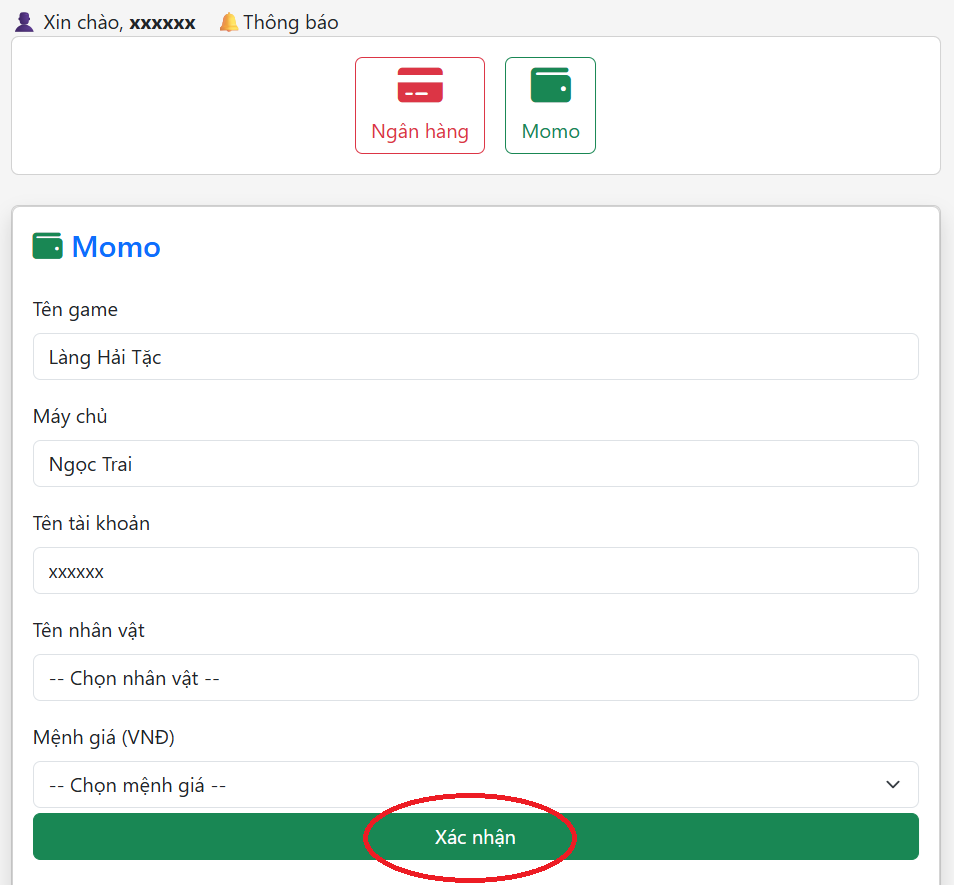 Trường hợp chọn Momo: Điền đầy đủ thông tin chọn thêm tên nhân vật muốn nạp, gói nạp muốn nạp sau đó bấm Xác nhận (khoanh đỏ)