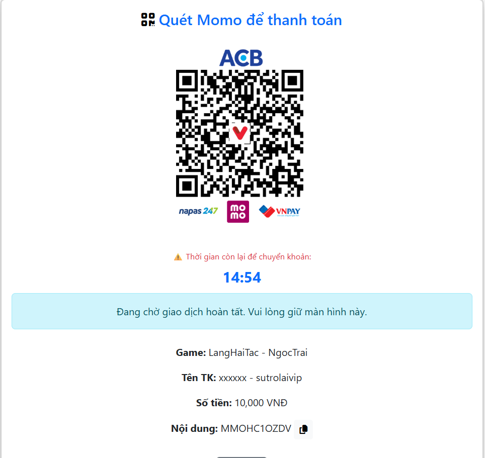 Sau khi bấm OK sẽ hiển thị trang quét mã QR nạp, mọi người vào Momo quét mã QR để hoàn tất. Sau khi nạp xong website sẽ trả về thông báo nạp thành công.