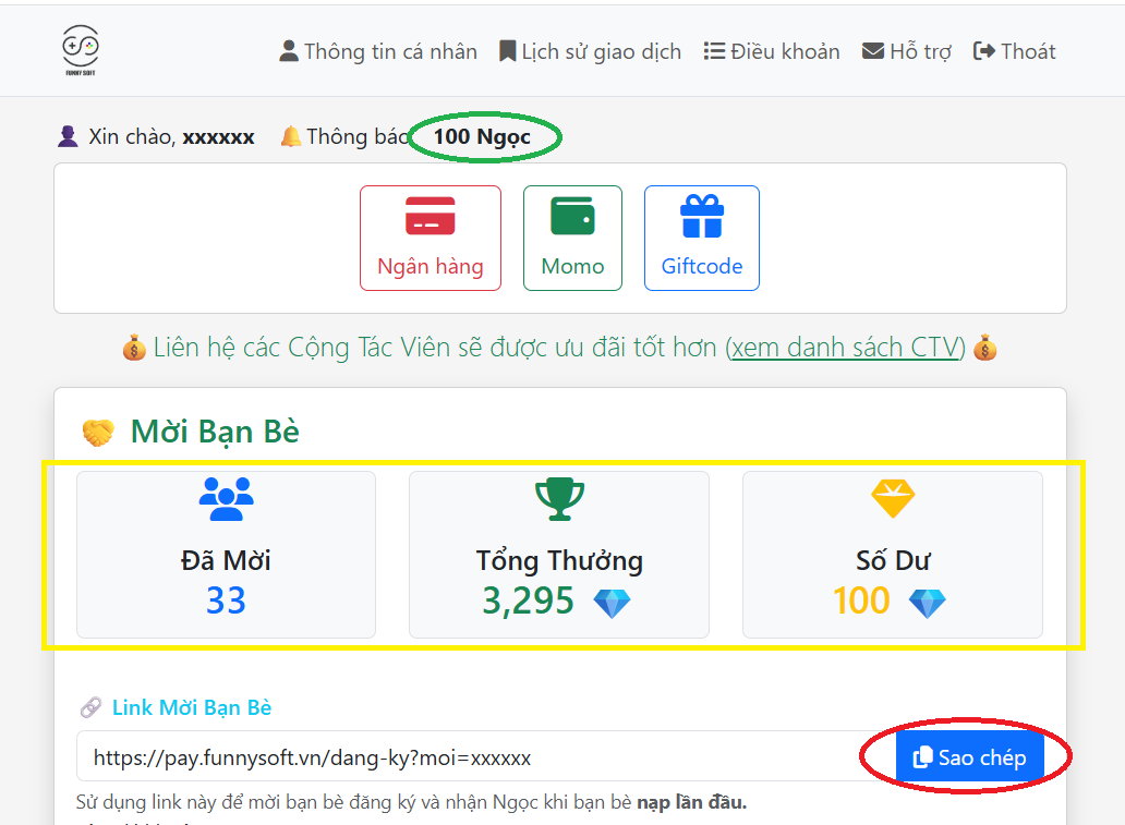 Bước 3: Copy link mời gửi cho bạn bè (Bấm nút sao chép khoanh đỏ), Khoanh xanh hiển thị số ngọc đang có, Khoanh vàng gồm: Số bạn đã mời thành công, Tổng số Ngọc đã nhận từ mời bạn bè, Tổng số ngọc khả dụng (còn lại).