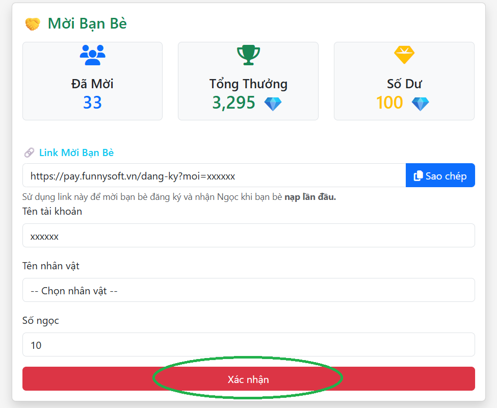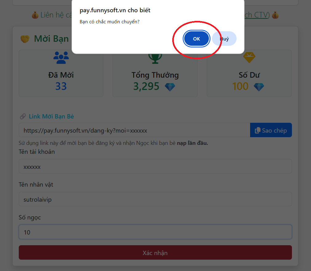 Bước 4: Hướng dẫn cách chuyển ngọc vào nhân vật, ở Form chọn thông tin tên nhân vật cần chuyển ngọc, nhập số lượng Ngọc cần chuyển tối thiểu là 10. Sau đó bấm nút Xác nhận (khoanh xanh)